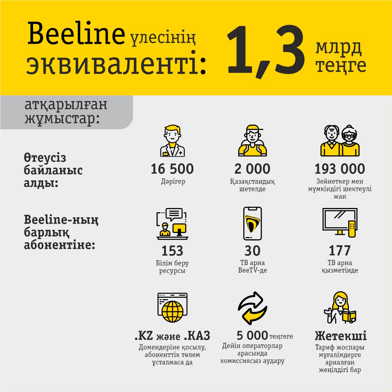 Карантин мен ТЖ кезінде Beeline .KZ және .КАЗ домені бар қазнет ресурстарына тарифсіз қосылу мүмкіндігін, сондай-ақ өзекті тариф қатарына қосылған мобильді байланыс абоненттері үшін желі ішінде тарифтелмейтін қоңырау шалу мүмкіндігін ұсынды. Орнықты интернетті қолданушылар да қазақстандық ресурстарға абоненттік төлем төлемей қосыла алады. Одан бөлек, Beeline-ның барлық клиенті әлеуметтік маңызы бар ресрустарға трафик шығындамай қосылу мүмкіндігіне ие. Мысалы, мемлекеттік сайттарға, білім беретін және медициналық ресурстарға шексіз қосылуға болады. Қазір тізімде 153 атау бар және ол үнемі көбейіп отыр. Арнаулы «Керемет» тарифі мұғалімдердің байланыс қызметтерін жеңілдігі бар бағамен пайдалануына мүмкіндік береді. «Біз шеккен зиянымыз бен ала алмаған табысымызға қарап жатқан жоқпыз. Бүгінгі таңда, қауіпті аймақта жүрген мұқтаж жандарға байланыс ұсыну аса маңызды. Beeline клиенттерін әрдайым қолдайды және атқарған ісіміз ниетімізді тағы да растай түседі. Оған қоса, орын алған дағдарыс жағдайында барлық жұмыс орнын сақтап қалдық, демек, қалыптасқан жағдайға қарамастан Beeline өте маңызды, әрі Қазақстандағы ең ірі салық төлеушілердің бірі болып қала береді», - деді Beeline Қазақстанның Бас атқарушы директоры Евгений Настрадин.